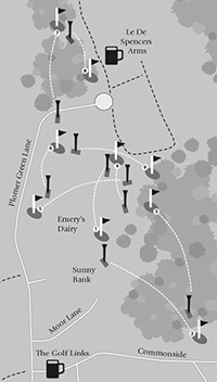 Between the wars that part of Downley Common which is still largely open today was a nine hole golf course and opposite the gates to the course used to stand a pub called The Golf Links. Some years ago Frank Hyde 0ne of our old regulars, left a pencil sketch in the pub of the course layout as it was in 1939. That layout is replicated alongside.